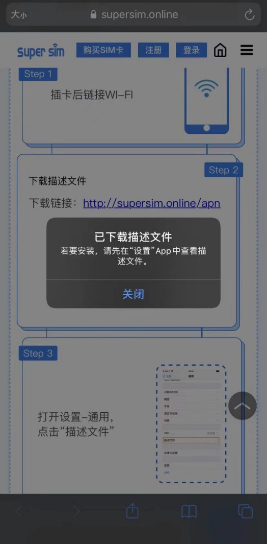 点击STEP2中的链接或扫描二维码后,弹出左下图提示,点击“允许”。下载完成后弹出右下图提示,点击“关闭”