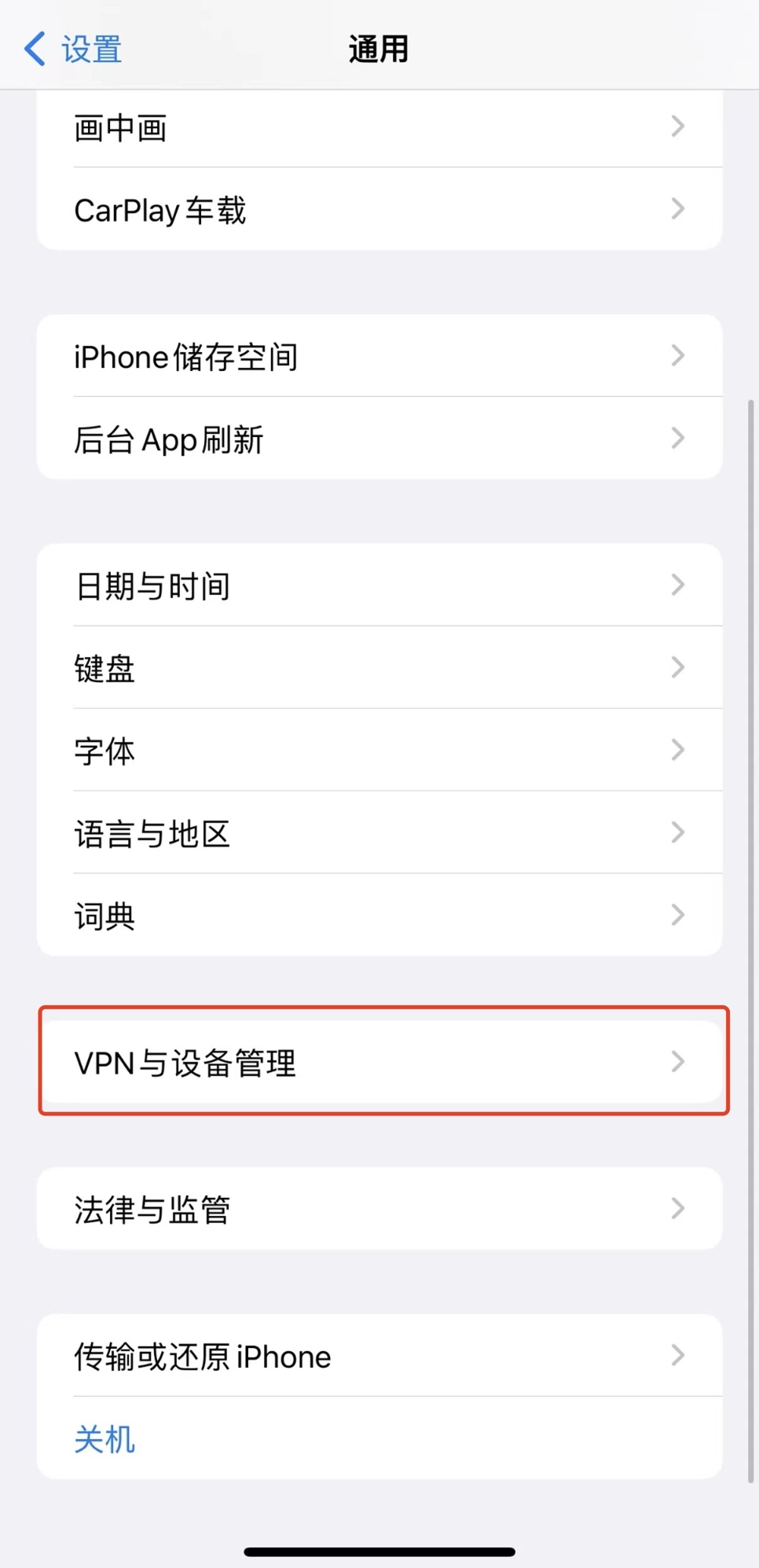 点击「VPN与设备管理」。
